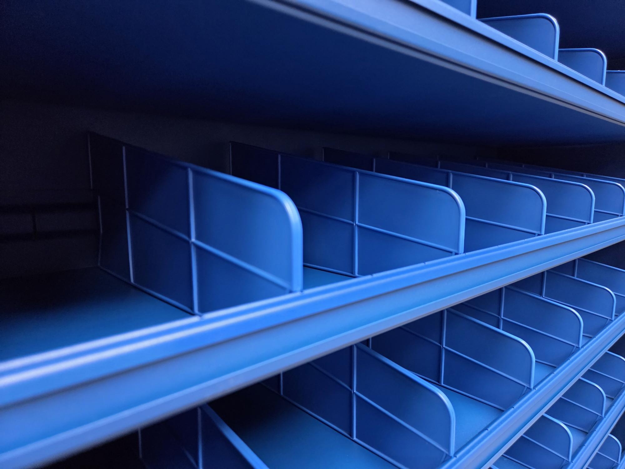 HC vakkenkast, nieuw, afmeting: 200x100x30cm, inclusief 72x kunststof tussenschot, 13 legborden, kleur: blauw (RAL5010)
