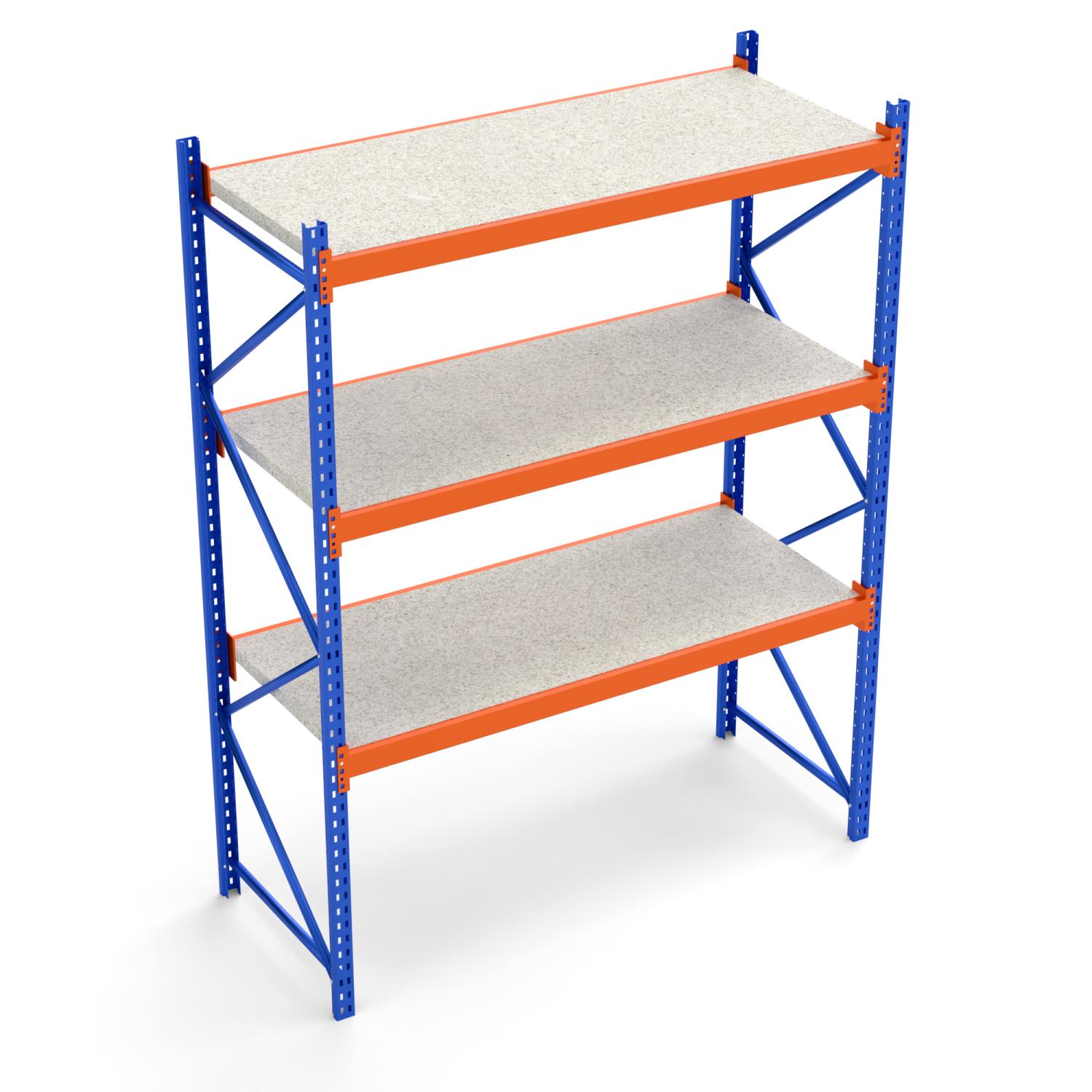 Set bestaande uit: 2x Staander 200x60cm, blauw, ongemonteerd 6x Ligger 245cm, kleur: oranje 12x Borgpen 3x Spaanplaat legbord 243x54,5cm, 28mm dik