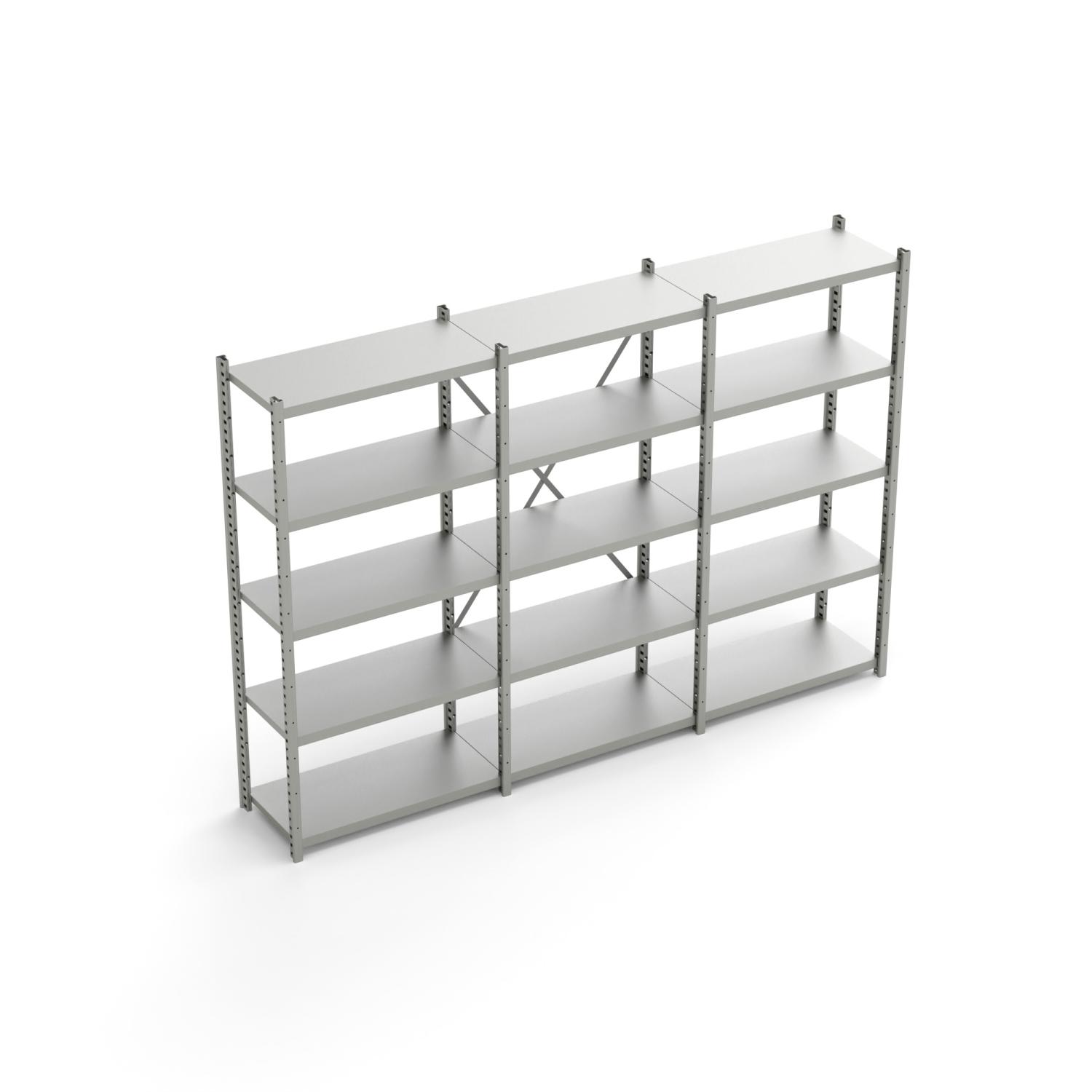1 rij, 3 vakken, elk vak met 5 legbordniveaus 8x Stijl 200cm 8x PVC Voet 30x Legborddrager 50cm 15x Legbord 100x50cm 1x Kruisschoor, incl. schroeven