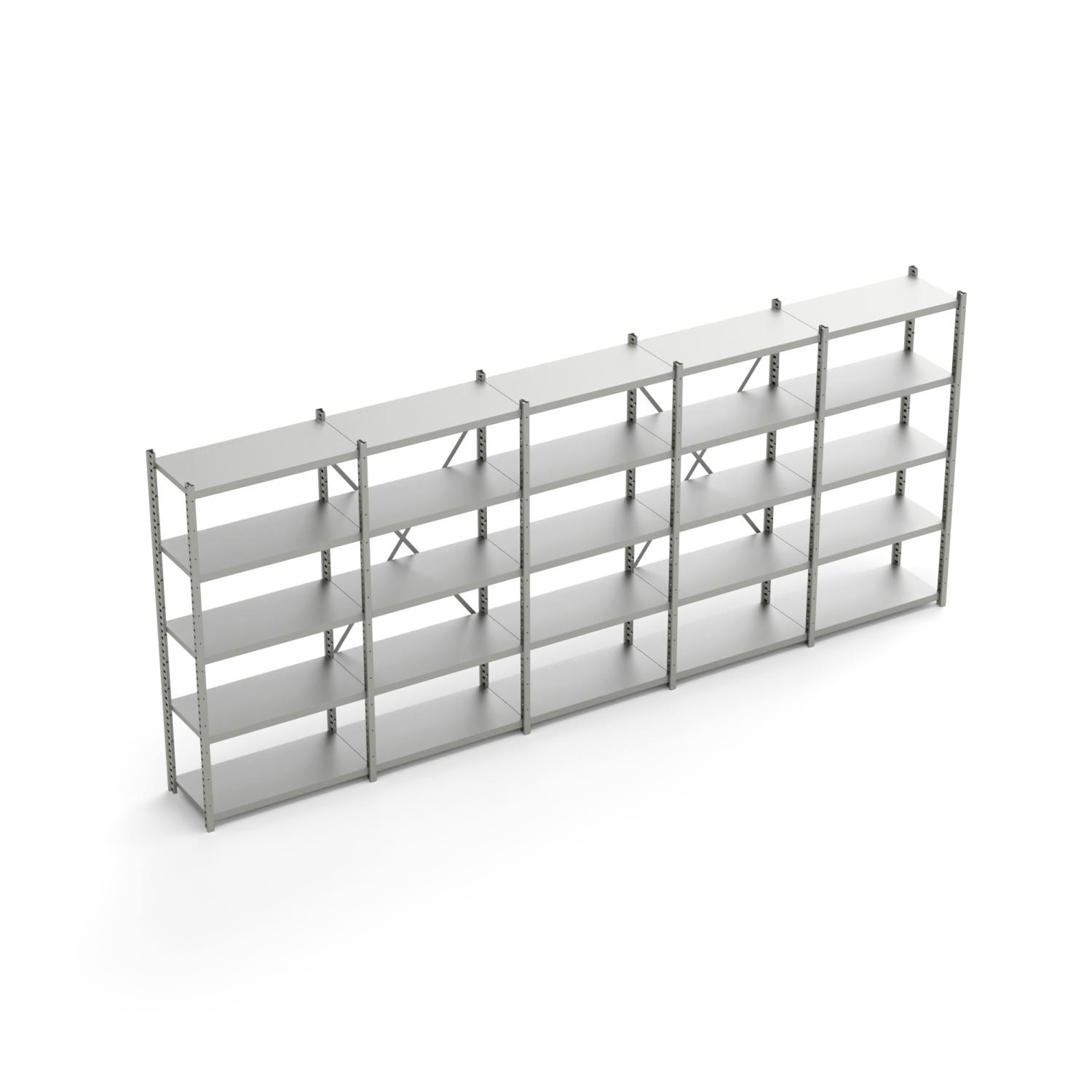 1 rij, 5 vakken, elk vak met 5 legbordniveaus 12x Stijl 200cm 12x PVC Voet 50x Legborddrager 40cm 25x Legbord 100x40cm 2x Kruisschoor, incl. schroeven