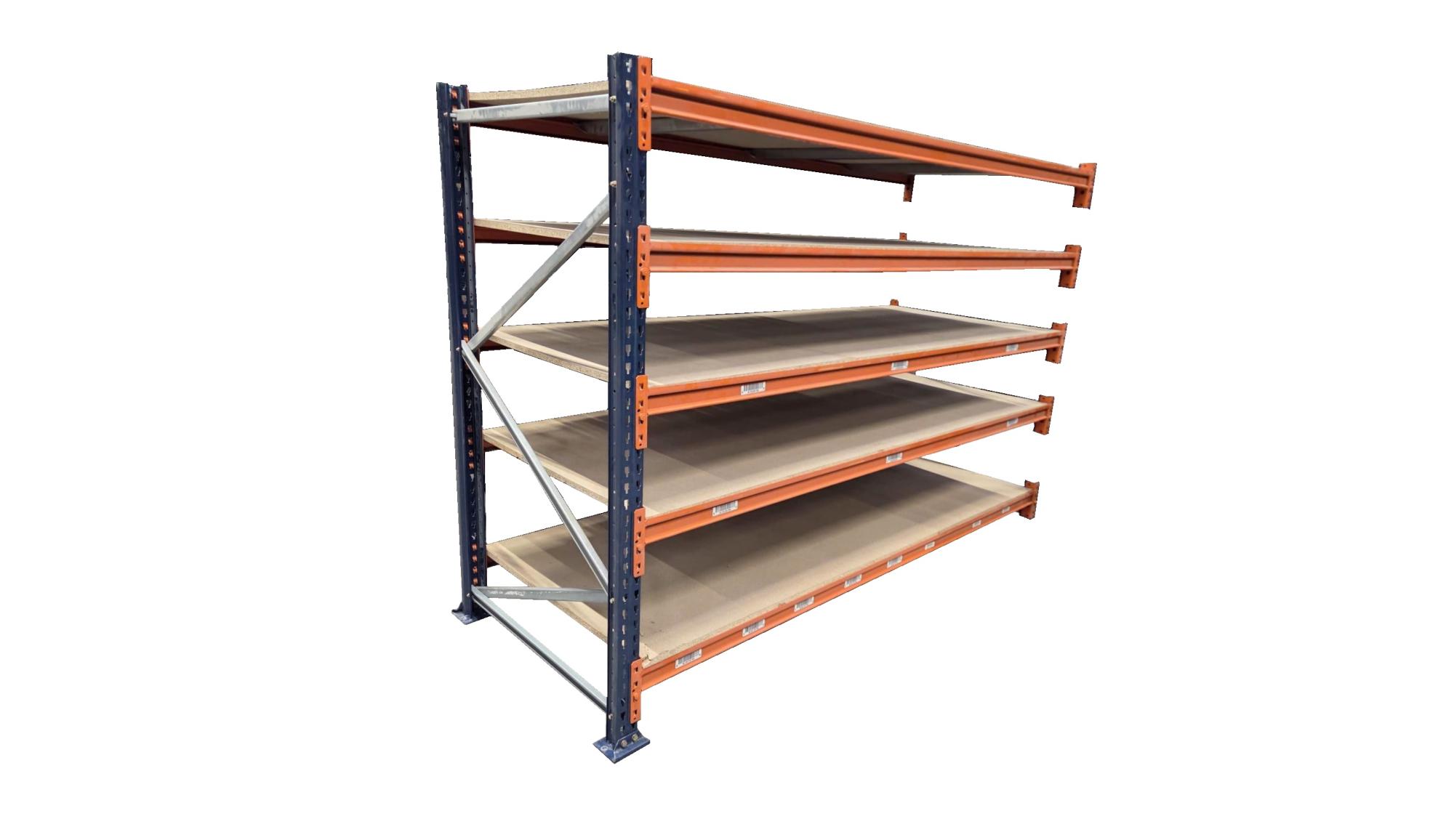 Set bestaande uit: 1x staander 200x110cm, voorgemonteerd, 10x ligger 270cm, 20x borgpen, 5x spaanplaat legbord 268x110cm, incl. 3 diepteliggers